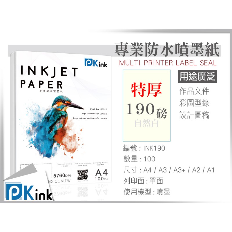 Pkink 彩色防水噴墨紙190磅 自然白 A4 A3 辦公室 印表機 美術紙 設計 印刷 報告 蝦皮購物